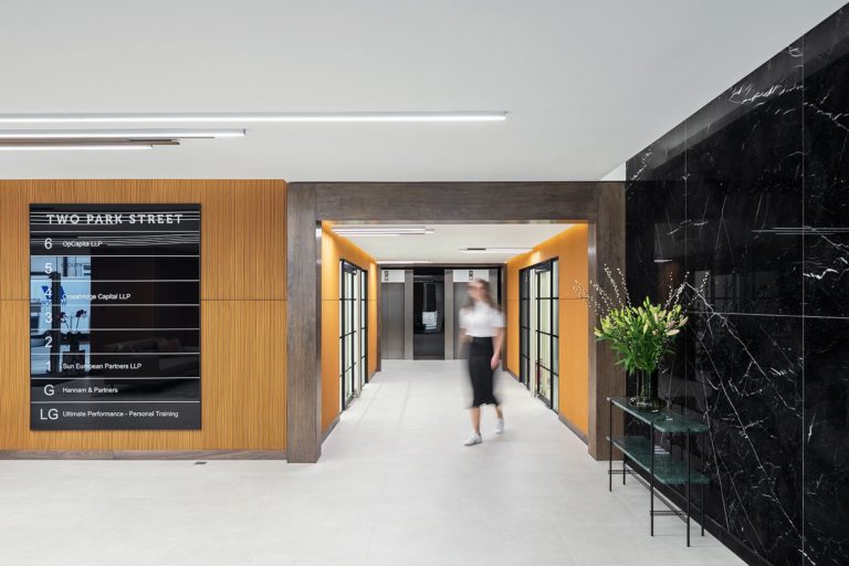 21 Construction instructed Konix to supply and install large format floor tiling to the main reception at 2 Park Street.