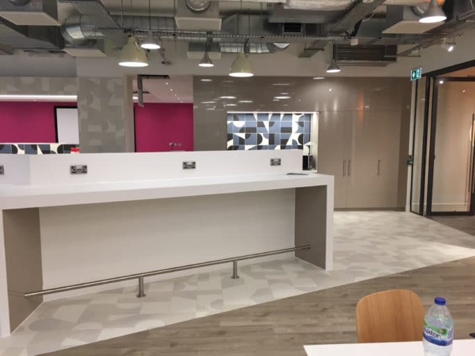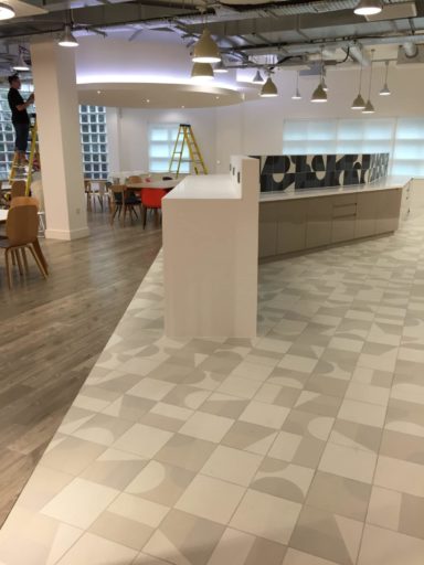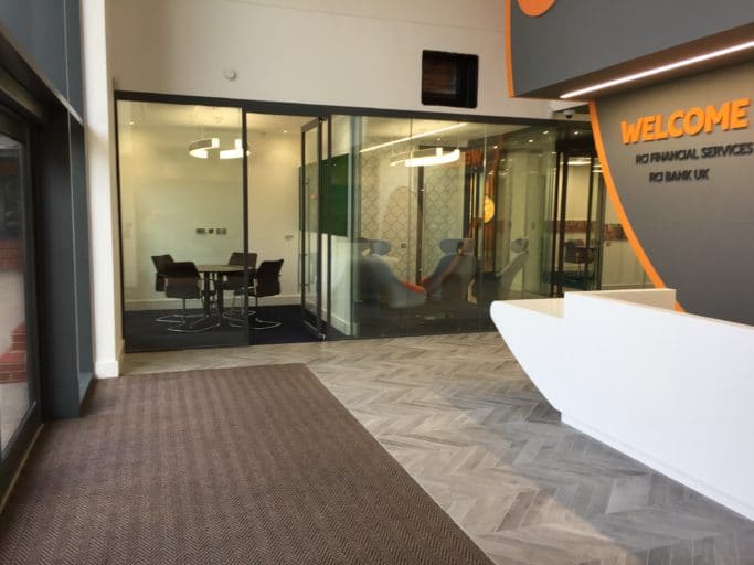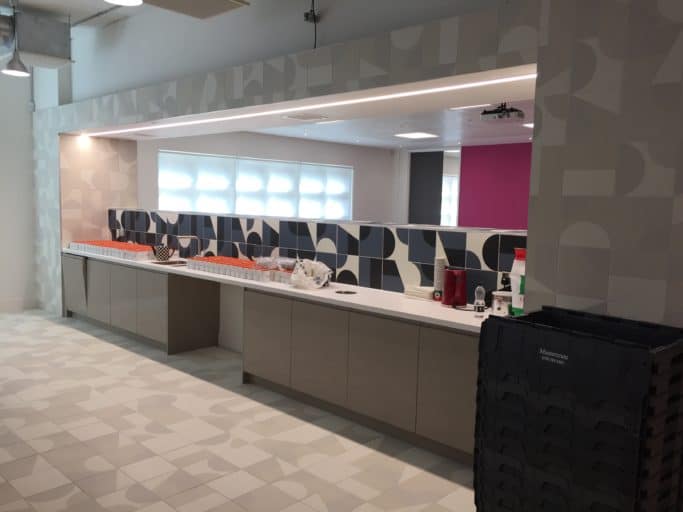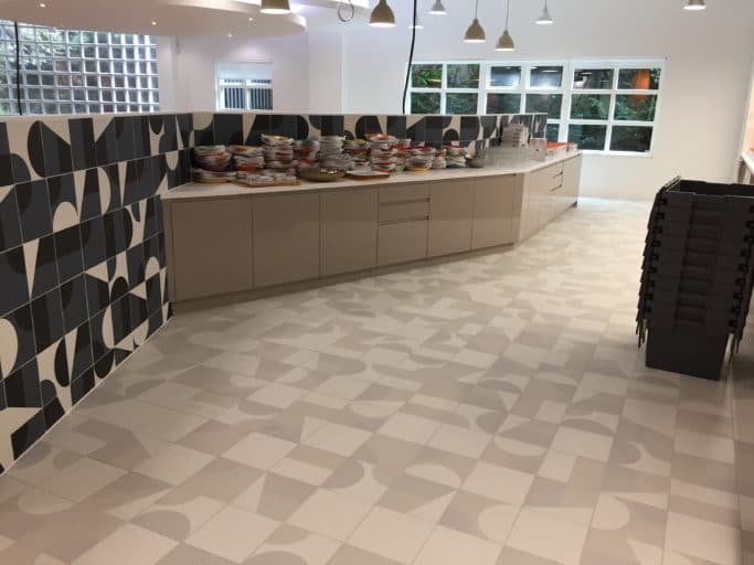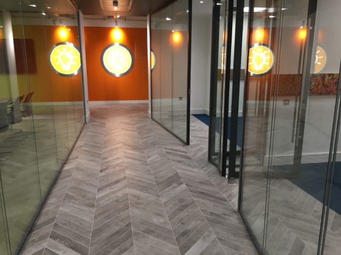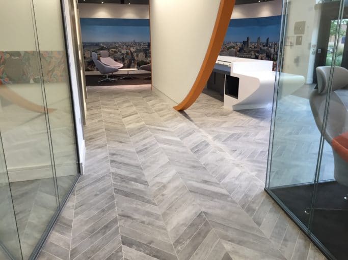 Od Interiors instructed Konix to complete complex chevron floor tiling, and detailed puzzle tile arrangements to floors, walls & splash backs, for RCI Financial.
